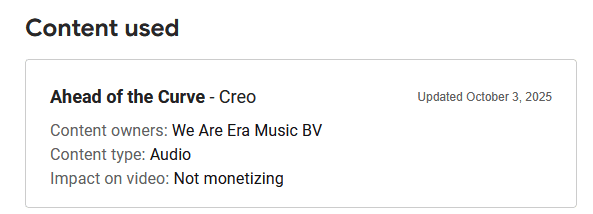 While I don’t live, or rely, on YouTube for revenue, I have been finding it extremely annoying that I am getting daily emails now as I received copyright claims on all of my past live streams primarily due to the audio “Ahead of the Curve – Creo” and “Rock Thing – Creo” are used each time I go live.