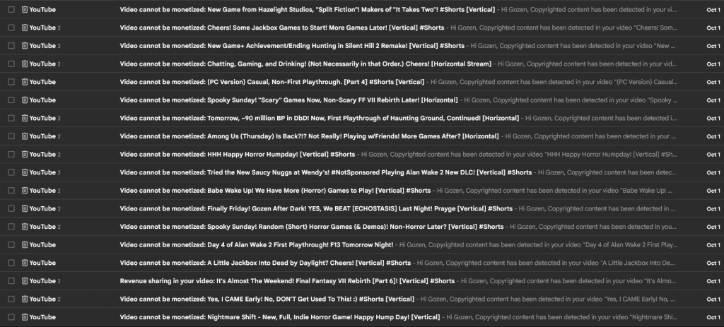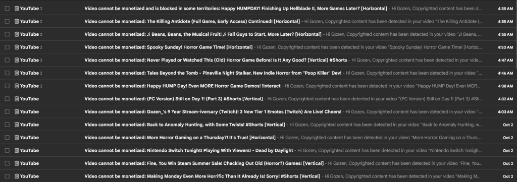 Look, I totally get why Gozen and countless other people haven’t (yet) contested these claims – We Are Era inundates your inbox with so many of them and you have to manually file appeals on every single one, as you can see from the screenshots above. It’s overwhelming, and if you don’t rely on revenue from your streams (as is the case here), you figure your time’s better spent doing more productive stuff.