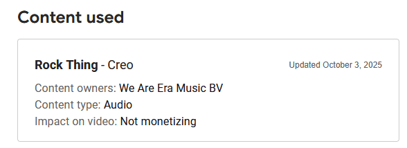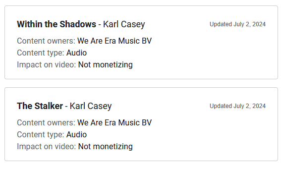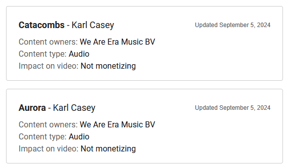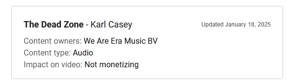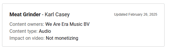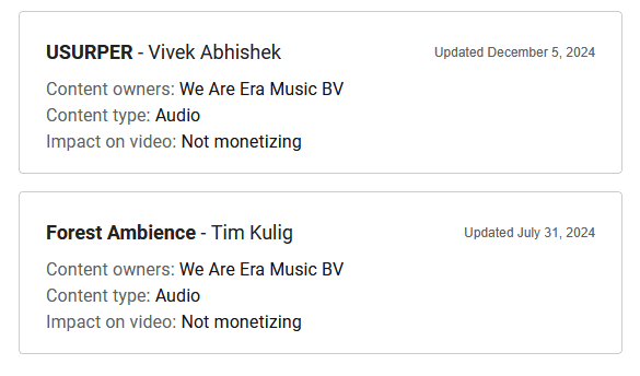 I am an individual who streams to YouTube daily for many years now. As such, I have been using the same music on my streams for years during my “intro” and “outro”, and just a couple of weeks ago, “We Are Era Music BV” has claimed this music.