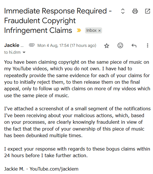 I blogged about it back then, which elicited an apology from the company and put a stop to their attempt to illegally steal my content — https://jackiem.com.au/2018/06/13/how-i-deal-with-fake-youtube-copyright-claims-by-believe-music/