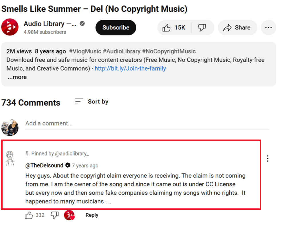 I even captured a screenshot of a public statement by Del, who said the copyright claims were not coming from him, and that they were fraudulent —
