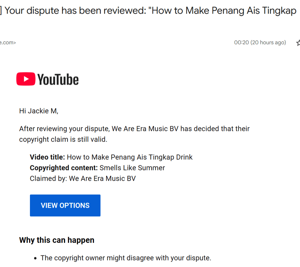 And I get a warning from YouTube that says (I’m paraphrasing) — if I choose to appeal one final time, and the “copyright owner” (ie. We Are Era) rejects it again —